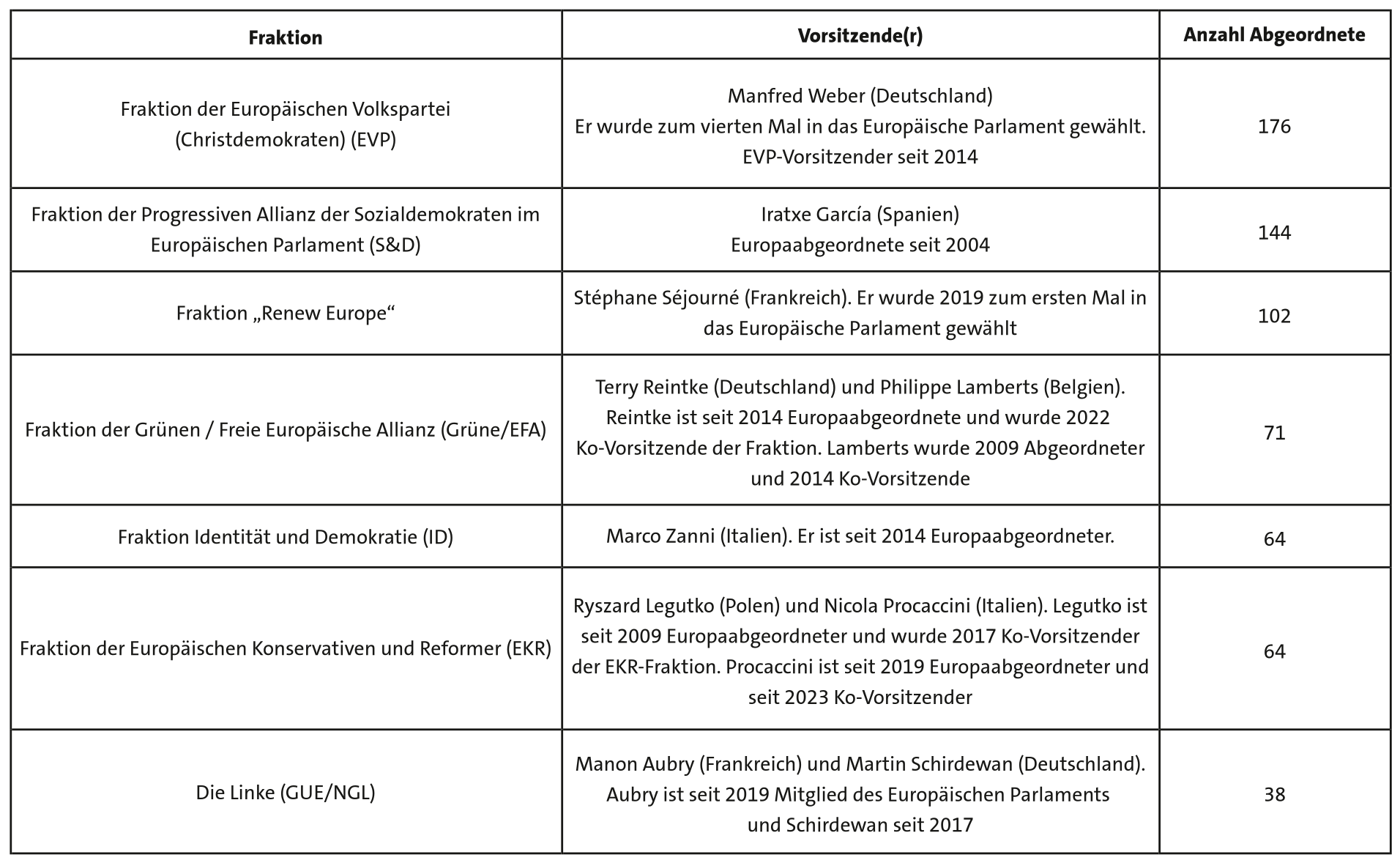 Nach der Geschäftsordnung des Parlaments muss eine Fraktion mindestens 23 Abgeordnete umfassen, die in mindestens einem Viertel der Mitgliedstaaten, derzeit also sieben Mitgliedstaaten, gewählt wurden. Europa-abgeordnete können nur einer Fraktion angehören. Sie können sich jedoch auch keiner Fraktion anschließen und bleiben „fraktionslos“. Derzeit gibt es 46 Fraktionslose (NI – auf Französisch „Non-Inscrits“). Fraktionen können jederzeit während der Wahlperiode gebildet werden. Derzeit erfüllen sieben Fraktionen die notwendigen Kriterien.